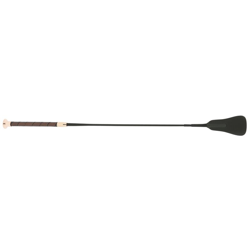 Fiberglaskern mit Nylongespinst. Rutschfester Griff. Offene PU-Klatsche. Knopf je nach Gertenfarbe roségolden oder silbern.