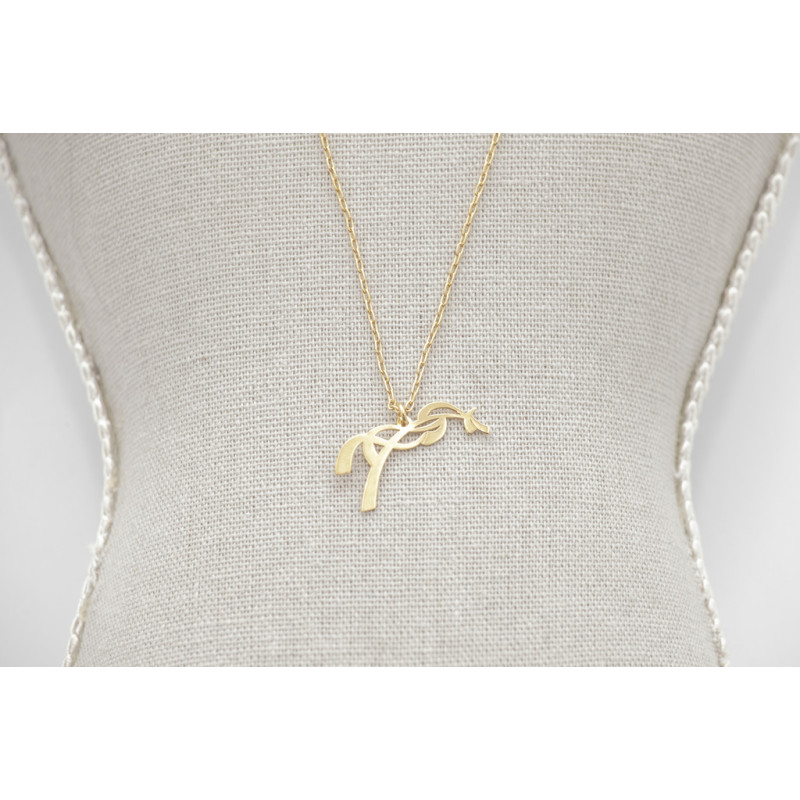 Collier doré composé d'une fine chaîne rehaussée d'un pendentif Pénélope. Il s'attache à l'arrière du cou et a deux niveaux de réglage. À l'extrémité de la chaine, il y a une petite breloque rectangulaire sur laquelle est gravée le monnogramme PL.