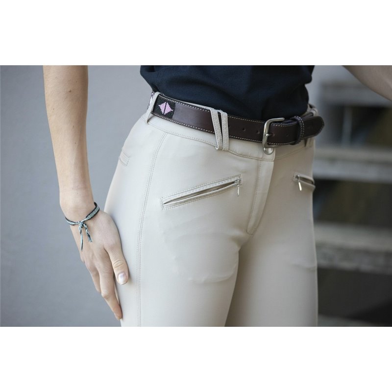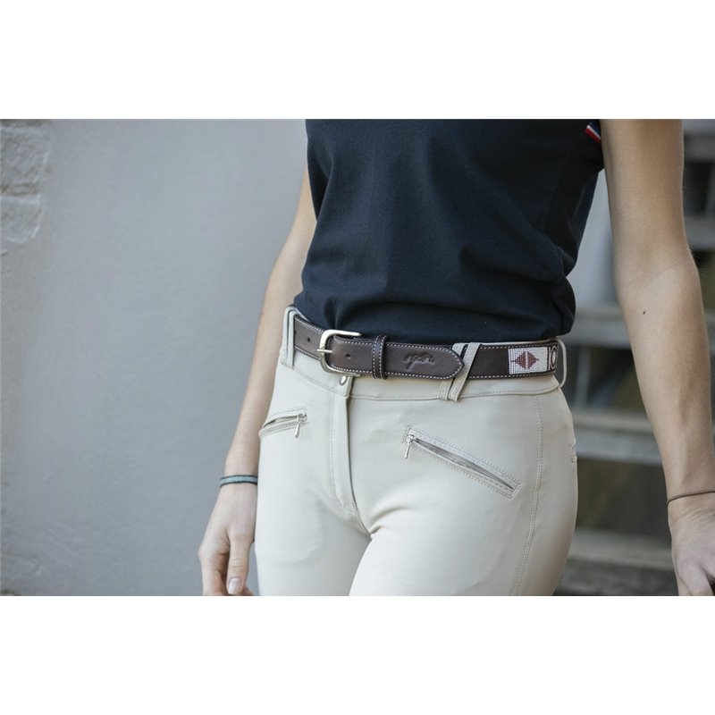 La ceinture "Pearl" est faite d'insertions de perles cousues sur une base en cuir. Les coloris et motifs des perles changent selon la couleur du cuir, bien qu'elles restent dans la même inspiration. La boucle est de couleur argent. Composition : cuir de vachette, bouclerie inoxydable.