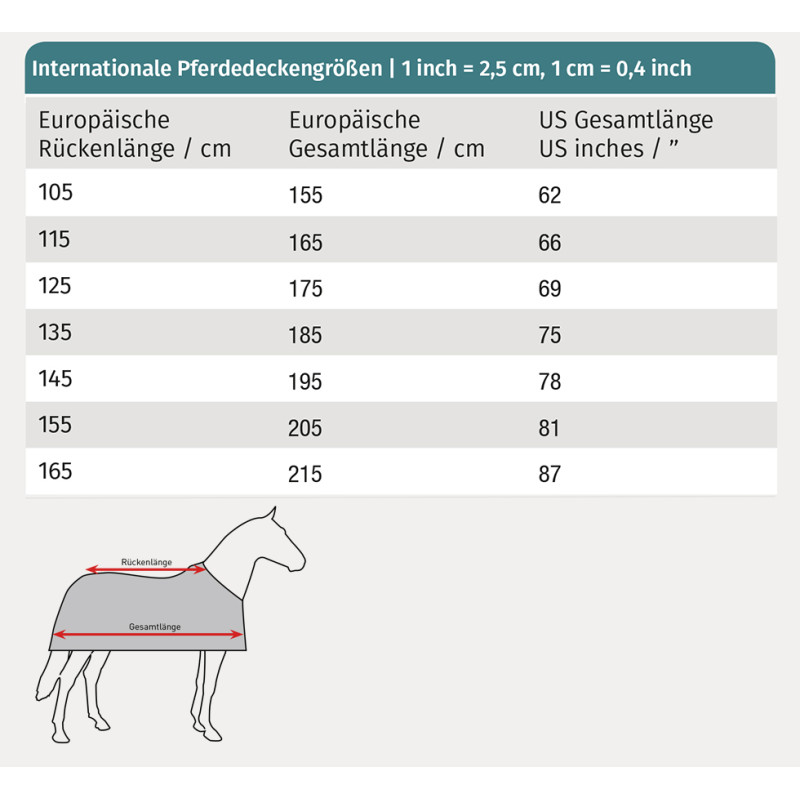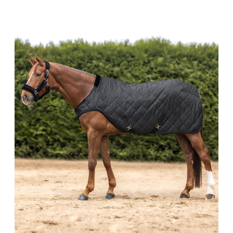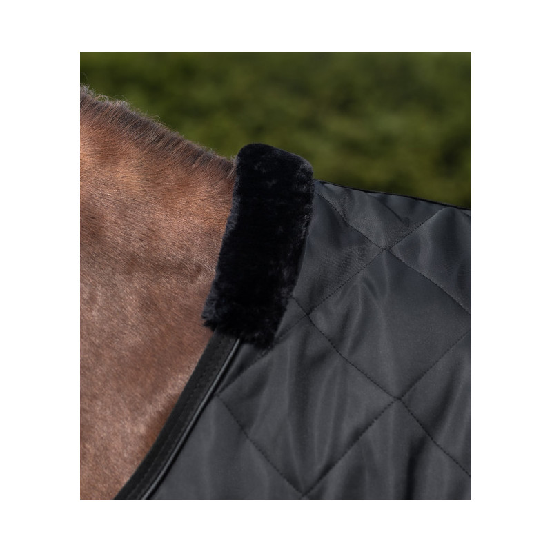 Couverture de manège de grande qualité, doublée d’une peau de lapin synthétique pour la saison froide. La peau de lapin particulièrement douce conserve parfaitement la chaleur du corps du cheval et évite les frottements. La peau de lapin au niveau du garrot évite les points de pression. La couverture est dotée de sangles croisées réglables en longueur, d’une fermeture en T à l’avant et d’œillets métalliques pour la fixation d’une courroie de queue.