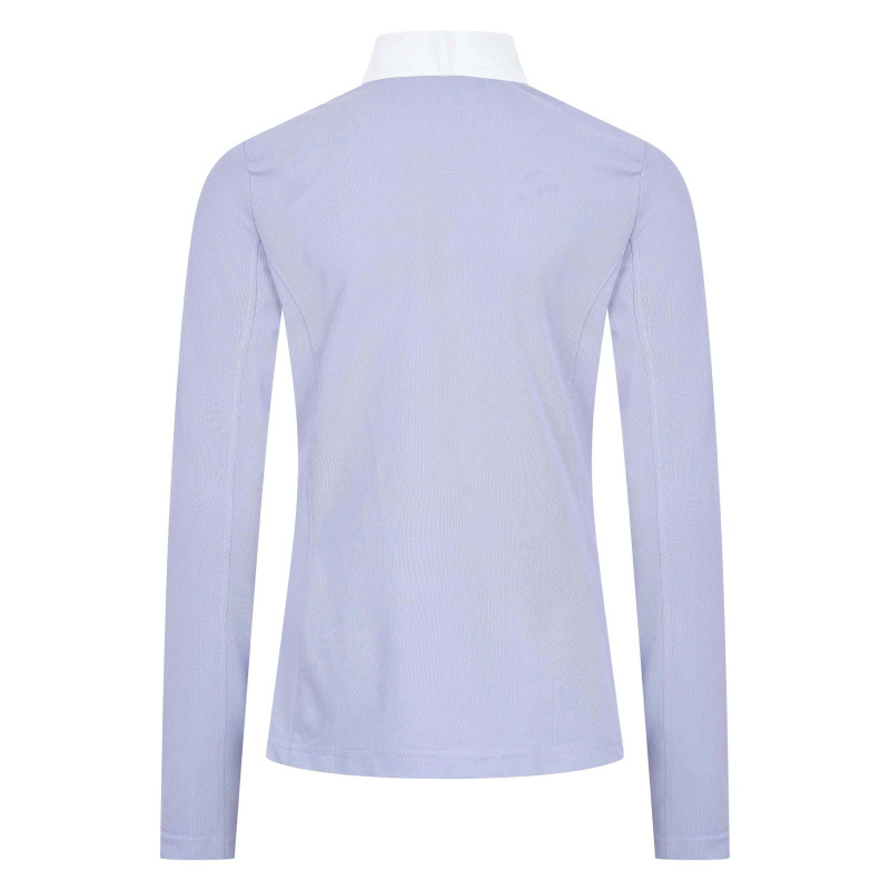 "Rehaussez votre style équestre avec notre top de compétition en mesh orné de détails de col en strass, de fermetures éclair discrètes, et d'un logo éblouissant orné de pierres."