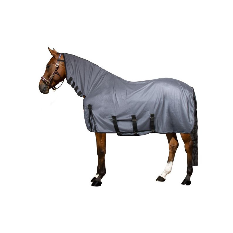 La couverture anti-mouche anti-UV avec encolure fixe et masque amovible est constituée de mesh fin. La couverture protège le cheval des moustiques et des mouches, et prévient la décoloration du cheval par le soleil. Avec une doublure en nylon au niveau de l’épaule et de la crinière, un gousset et une fermeture velcro et à boucle au niveau du poitrail. Comprend une fermeture velcro au niveau du coup et un trou pour les oreilles. Le rabat de poitrail ajustable dispose de trois attaches anti-rotation. Par ailleurs, la couverture dispose également d’un très long rabat de queue avec courroie de queue et de courroies de jambes élastiques. Le masque comprend une fermeture velcro et un extrafort en polaire.