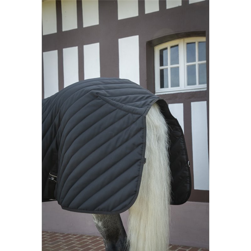 Couverture d'écurie issue de la collection Diagonale, au matelassage oblique de 400g d'épaisseur. Une bande de mouton synthétique protège la basse de l'encolure et la zone du garrot.