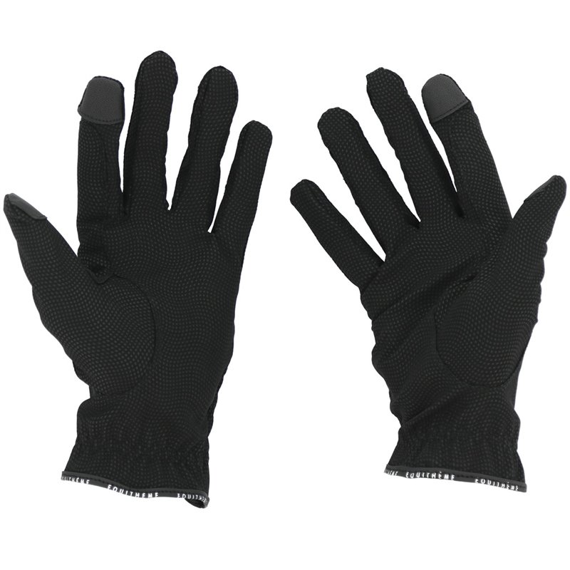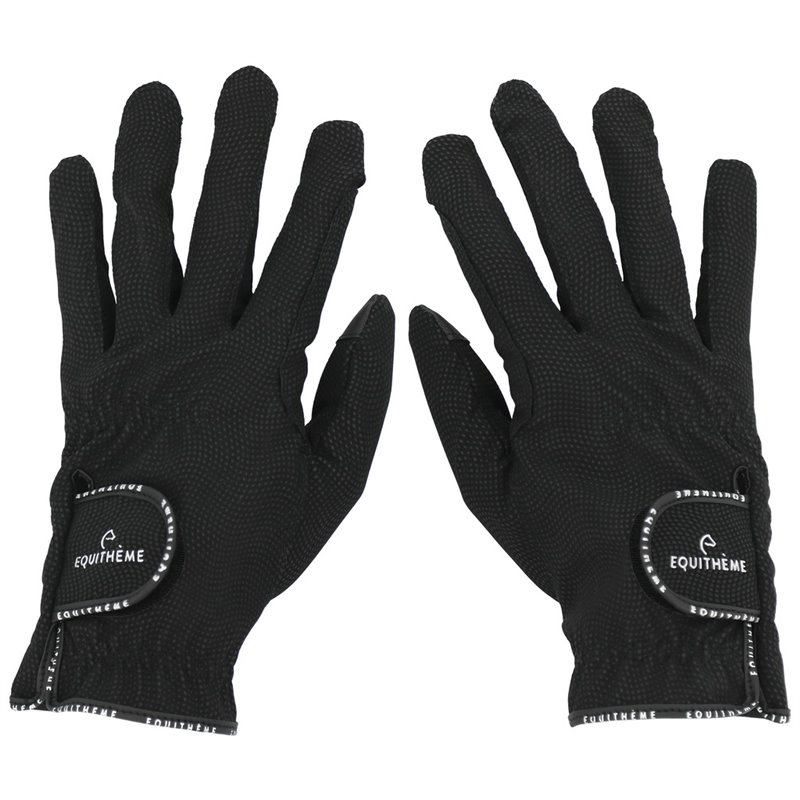 Gants stretch et résistant, fabriqué à partir d'élasthanne robuste et respirant. CARACTERISTIQUES : - Fermeture réglable par velcro marquée EQUITHÈME pour un enfilage rapide et pratique - Excellente adhérence sur les rênes - Manchette élastiquée pour un meilleur ajustement -Serrage sur dessus de la main pour un meilleur maintient -Renforts placés au niveau de l'index et du pouce - Touche tactile pour une utilisation confortable de vos appareils électroniques DÉTAILS : 55% polyester, 40% polyuréthane et 5% élasthanne.