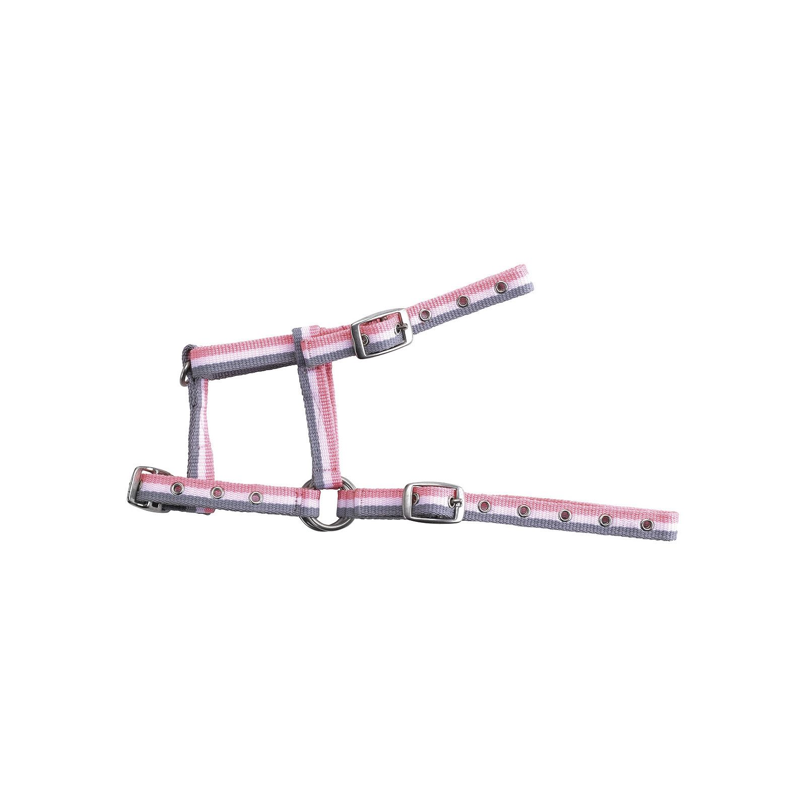 Licol en polypropylène double épaisseur avec muserolle, sous-gorge et têtière entièrement réglables par boucles. Equipé d'œillets métalliques et d'une bouclerie satinée grise.
