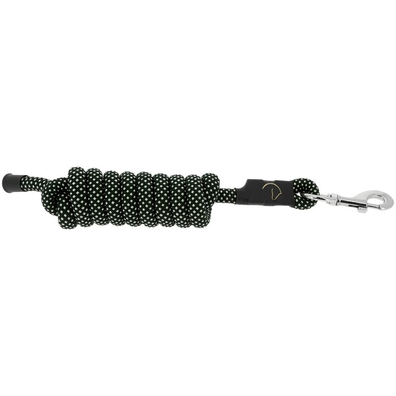 Longe en polypropylène bicolore tressé et protection d'attache en caoutchouc, marquée du logo EQUITHÈME doré.