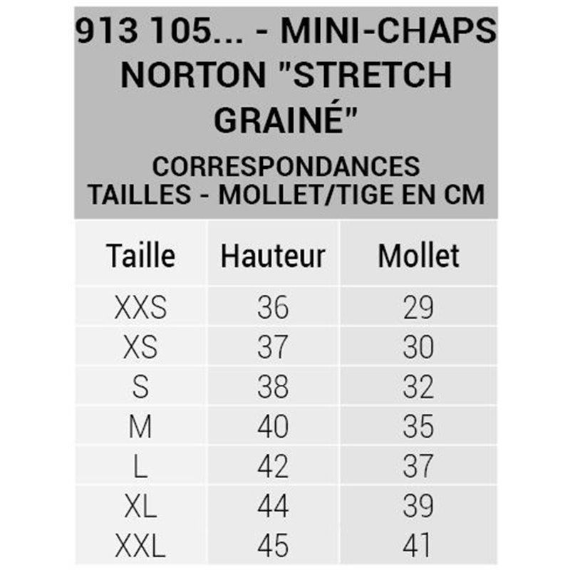 Mini-chaps synthétiques en polyuréthanne aspect cuir grainé avec effet galbant gràce à la doublure en tissu "stretch" Micro Touch élasthanne. Passage de pied élastique et fermeture arrière à glissière YKK, sécurisée par un bouton pression sur rabat cuir au bas.