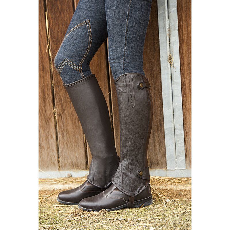 Mini-chaps en cuir vachette pleine fleur, finement grainé. En cuir souple elles s'adapteront parfaitement à votre mollet pour un confort optimal. Fermeture à  glissière "YKK" à  l'arrière sécurisée par des boutons pression sur rabat en haut et au bas de la tige. Passage de pieds élastique avec renfort cuir.
