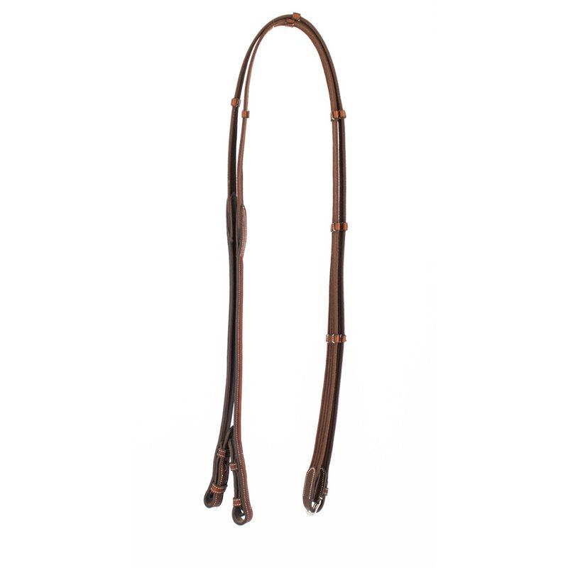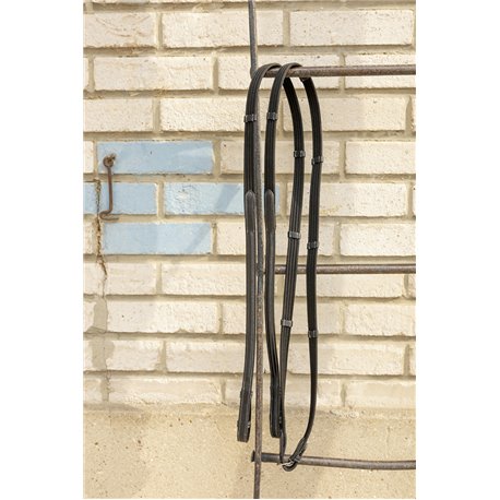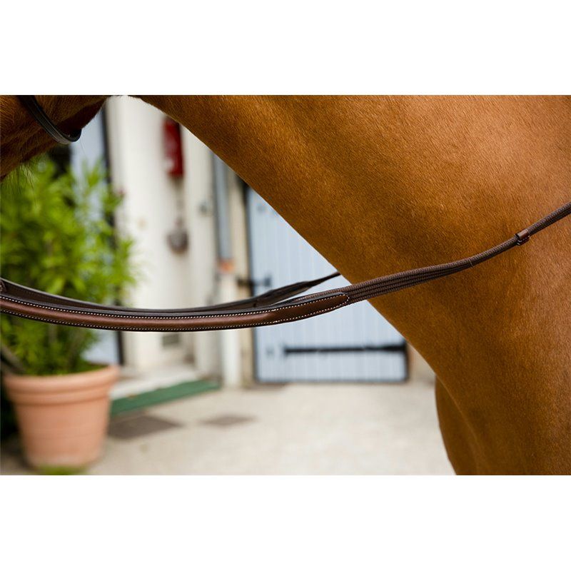 Rênes sangle assorties au bridon luxe, équipée d'arrêtoirs en cuir et d'arrêtoirs de martingale. Elles sont faites dans le même cuir que le bridon luxe. Surpiqûres couleur crème. Cuir 100% cuir de vachette bouclerie 100% acier inoxydable