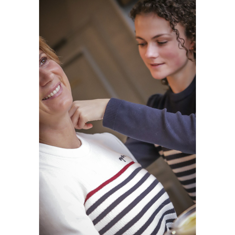 Pull "Maëlle" Pénélope issu de la collection Saint James x Pénélope. Dans le pur esprit de la marinière, notre pull Maëlle est confectionnée dans une maille alvéolée douce et légère. Sur l'épaule, à gauche, comme un vrai pull marin, le Maëlle s'ouvre grâce à trois boutons (un marine, un blanc, un rouge, tous les trois marqués du PL de la marque) Sur les épaules, une légère fronce dessine une silhouette féminine. Enfin, sur la manche gauche on trouve le logo Saint James et sur le cœur, le petit logo Pénélope. En écru/marine et écru/marine/bande rouge pailletée Disponible du XS au XL Composition : 100% coton Conseil de taille : Notre pull Maïwenn taille normalement, vous pouvez choisir votre taille habituelle. Conseil de lavage : Ce pull passe aisément en machine à 30°C. En revanche, il ne tolère pas le sèche-linge.