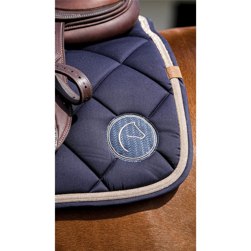 Tapis de selle 100 % polyester avec un liseré à paillettes sur la moitié arrière du tapis. - 8 mm de matelassage en losange. - Polyfil 300g/m². - Logo doré sur empiècement avec motifs glitter. - Intérieur en Coolmax très respirant. Lavable en machine à 30°C, pas de sèche-linge.