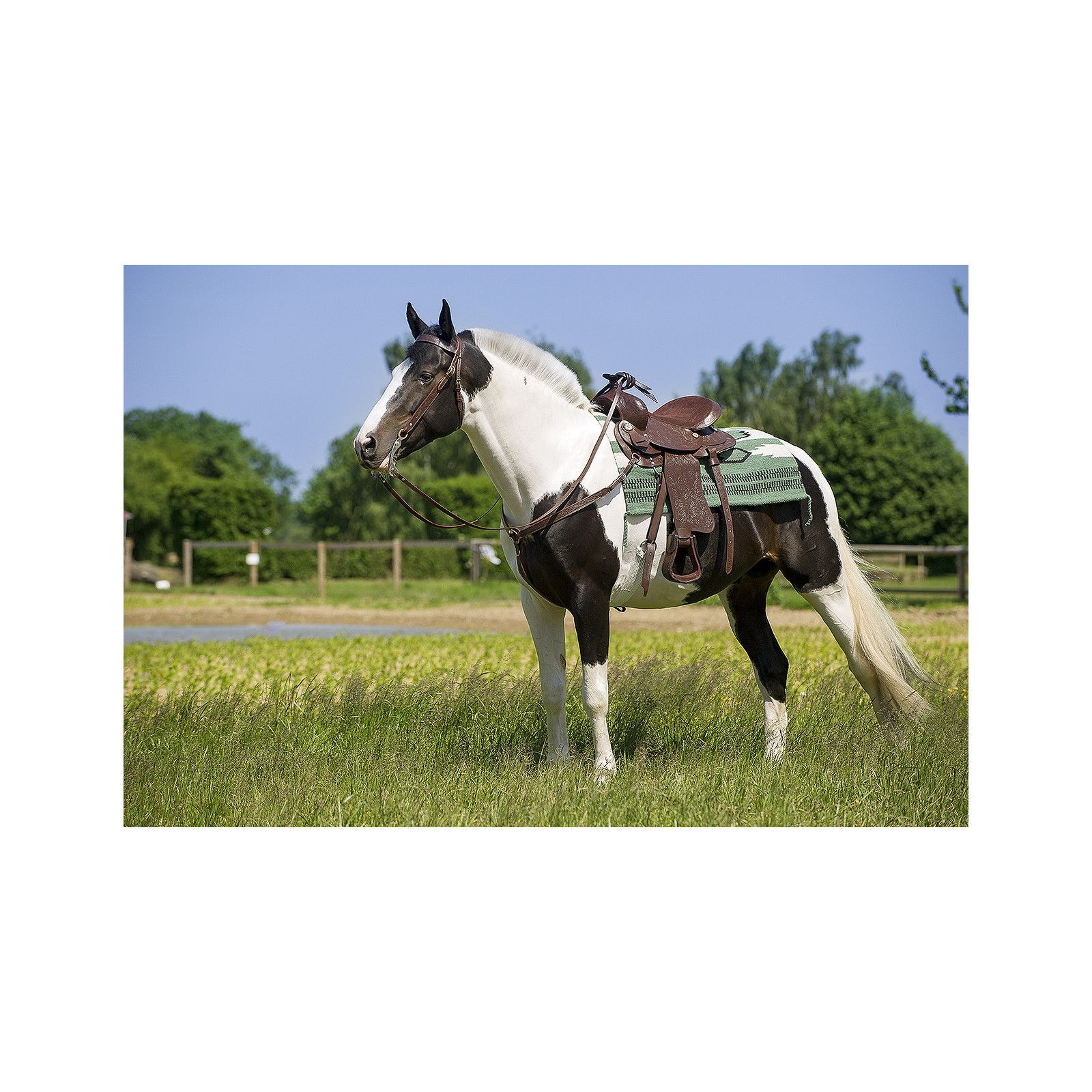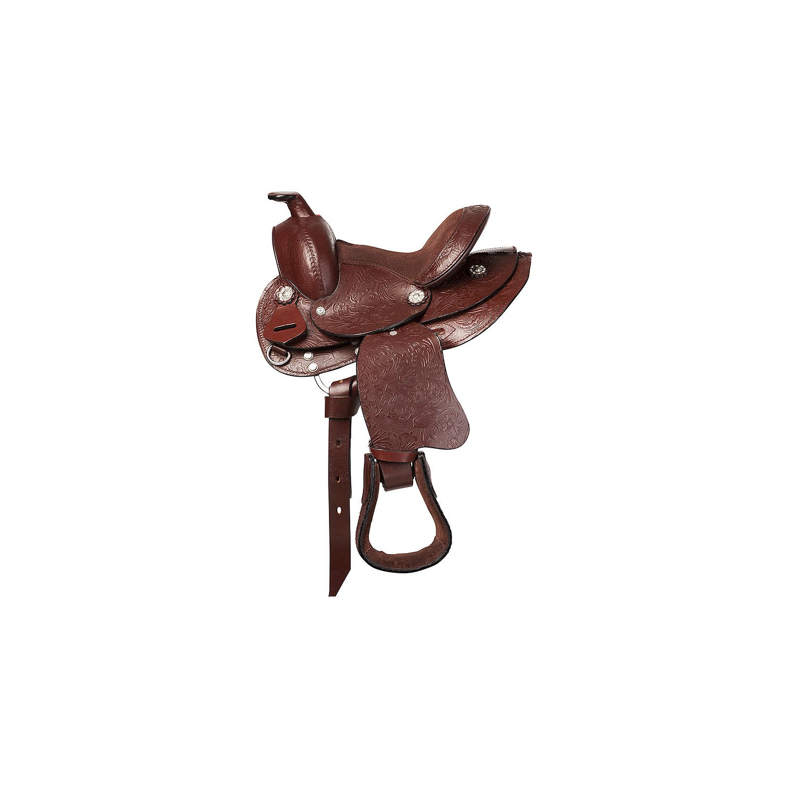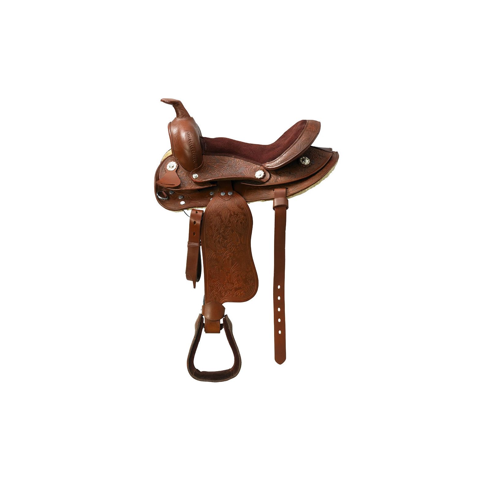 En cuir de buffle décoré de pyrogravures motif floral avec arçon type Rooper en fibre de verre. Quartiers carrés, siège recouvert cuir retourné et troussequin avec bordure cuir de buffle reprenant le motif floral. Sanglage traditionnel en cuir façon nœud de cravate. Sangle avant à brins. L'épais matelassage du siège et des panneaux améliore nettement le confort de la monture et de son cavalier. Etriers en bois recouverts cuir retourné et cuir de buffle.